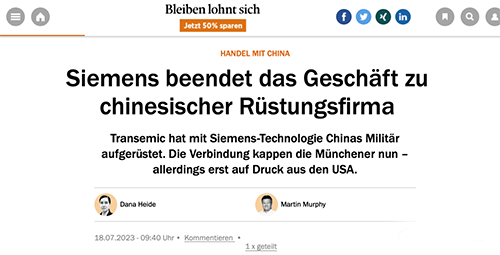近日德國《商報》報道,西門子終止了與北京天圣華信息技術有限責任公司(TranSemic)的商業聯系。西門子發言人告訴《商報》,與北京天圣華信息技術有限責任公司的所有交易均被阻止。原因是迫于美國的壓力。