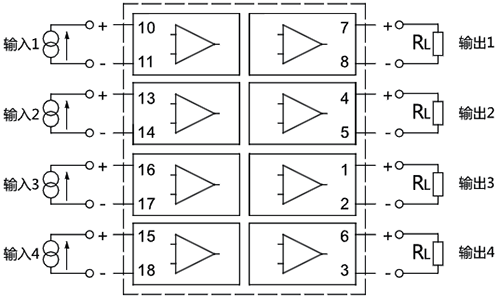 2、三入三出和四入四出輸入側(cè)獲取能量無源信號隔離器接線圖