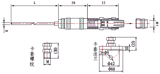 ◆型號為WR①KG②-61⑤/1⑦⑧-⑨/⑩/?/?/?/?的插件式鎧裝熱電偶可以與卡套螺紋和卡套法蘭組合成如下圖所示的不同安裝方式的鎧裝熱電偶: