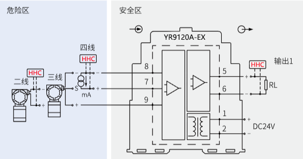 ①一進一出YR9120A-EX檢測端隔離式安全柵接線圖