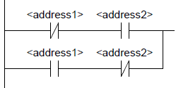 對于XOR函數(shù),必須按以下所示創(chuàng)建由常開觸點(diǎn)和常閉觸點(diǎn)組成的程序段。