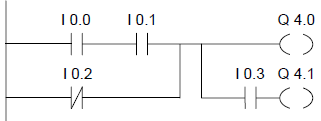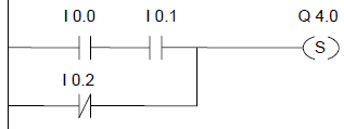滿足下列條件之一時(shí),輸出端Q4.0的信號狀態(tài)將是“1”:①輸入端I0.0和I0.1的信號狀態(tài)為“1”時(shí);②或輸入端I0.2的信號狀態(tài)為“0”時(shí)。