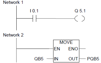 在此實(shí)例中,Q5.1為所需的立即輸出位;字節(jié)PQB5包含Q5.1位的立即輸出狀態(tài);MOVE(復(fù)制)指令還會更新PQB5的其它7位。