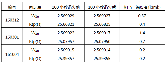 長期穩(wěn)定性參照規(guī)程的規(guī)定方法,鋁點(diǎn)標(biāo)準(zhǔn)鉑電阻溫度計測定了WZn和Rtp后,在上限溫度退火100小時再次測量WZn和Rtp,測量結(jié)果列于表1。