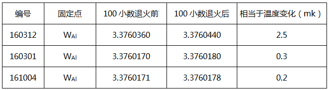 鋁點(diǎn)標(biāo)準(zhǔn)鉑電阻溫度計使用上限為660.323。按ITS-90規(guī)定必須經(jīng)鋁凝固點(diǎn)分度獲得WAl值后,方能計算出鋁點(diǎn)標(biāo)準(zhǔn)鉑電阻溫度計的a7、b7和c7數(shù)值。鋁點(diǎn)標(biāo)準(zhǔn)鉑電阻溫度計的WAl值由中國計量科學(xué)研究院測定,表3為100小時上限退火前后的WAl值。
