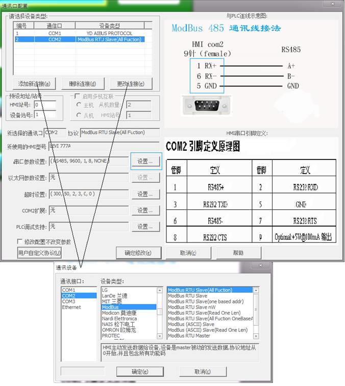 選擇實際的設備型號,對應需要讀取的串口,PLC類型(MODBUS),選擇Modbus RTU Slave(All fuction)