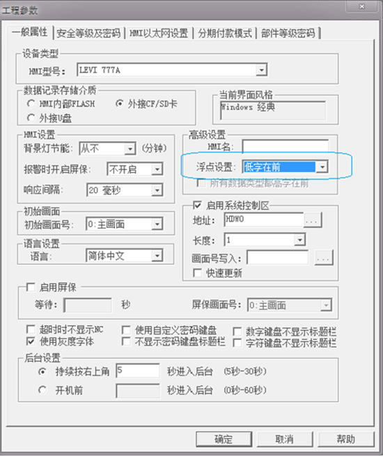 浮點數讀取(雙字也稱四字節浮點數),浮點數存放格式在HMI中有兩種選擇:低位在前和高位在前,在菜單設置----工程設置,打開如圖: