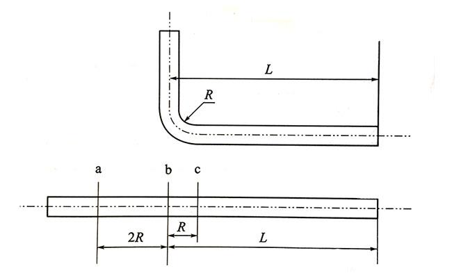 用手工彎管器彎鋼管時(shí),先在鋼管需要彎曲處劃上記號(hào),然后把彎管器套在被彎制的鋼管上,彎管器要分別放在被彎制鋼管的兩側(cè),如圖3所示。彎管時(shí)需要兩個(gè)人共同操作,其中一個(gè)人使用2號(hào)彎管器,作用是固定被彎管,另一個(gè)人使用1號(hào)彎管器,由其來進(jìn)行彎管,兩人的用力方向正好相反,如圖3中的箭頭所示。彎制質(zhì)量取決于操作1號(hào)彎管器的人,如要彎制圖3所示的直角彎時(shí),2號(hào)彎管器固定在c處不動(dòng),1號(hào)彎管器從a處用力向箭頭方向彎動(dòng),并逐漸向b端移動(dòng),直至彎成直角彎,這樣還可保證L的尺寸。鋼管彎制時(shí)要一次彎成,管子彎曲后,應(yīng)檢查有無裂紋和凹陷處。儀表管的彎曲半徑在《GB 50093-2013 自動(dòng)化儀表工程施工及驗(yàn)收規(guī)范》有規(guī)定,即“高壓鋼管的彎曲半徑宜大于管子外徑的5倍,其他金屬管的彎曲半徑宜大于管子外徑的3.5倍,塑料管的彎曲半徑宜大于管子外徑的4.5倍”。