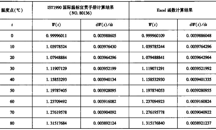 在Excel計算中,將W(t)、dW(t)/dt的計算結(jié)果比IST-1990國際溫標(biāo)宣貫手冊中多保留一位。從表1中可以看出,跟IST-1990國際溫標(biāo)宣貫手冊的計算結(jié)果是一致的,這也證明了采用該計算方法的可靠性。同樣,也可以采用該方法計算其他溫度段的分度值。