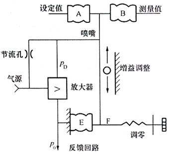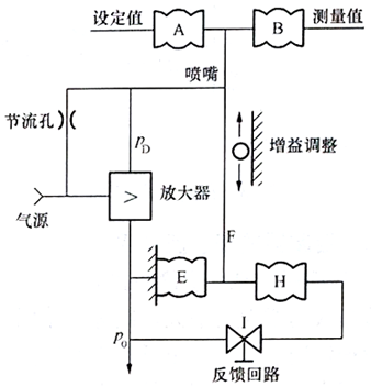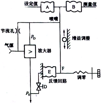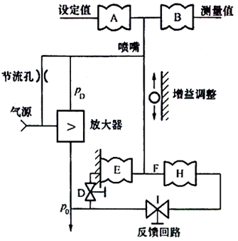 一個假想的氣動比例調節器原理如圖1所示。誤差的檢測由波紋管A和B來實現,測量值或設定值的任何變化都將導致擋板的移動,經噴嘴擋板機構放大后,至功率放大器再進行功率放大,其輸出P0又經反饋波紋管E和驅動桿F作用于擋板,最后使調節器輸出P0穩定在某一值,并實現與測量值和設定值之差成比例。氣動調節器的比例增益可通過改變增益調整球的上下位置進行整定,氣動調節器的輸出零點可通過調零彈簧進行調整,氣動調節器正作用、反作用可通過改變測量信號和設定值信號輸入波紋管A和B的方法來實現。在圖中,測量信號進入波紋管B,設定信號進入波紋管A,氣動調節器是正作用如果改為測量信號進入A,設定信號進入B,則變為反作用。