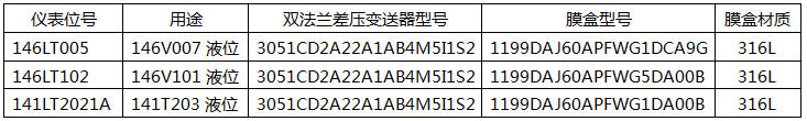 根據凈化裝置變換部分的合成氣和凝液的的成份組成(有CL-、S+、H+及灰份固體顆粒)和雙法蘭差壓變送器的選型原則,測量氯腐蝕、硫腐蝕、氫脆工況應選用316L加厚鍍金的雙法蘭差壓變送器。測量凈化裝置H2S濃縮塔141T203的塔底液位141LT2021A與介質接觸的隔離膜片的材質可以是純金屬鉭。