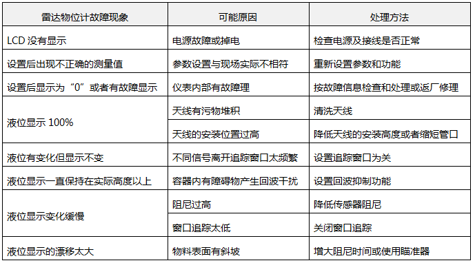 雷達物位計常見故障產生的原因及處理方法見表1。