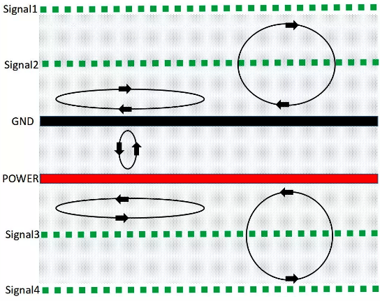 PCB疊層EMC規劃與設計思路的核心就是合理規劃信號回流路徑,盡可能減小信號從單板鏡像層的回流面積,使得磁通對消或最小化。