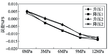 結果表明:靜壓對零點輸出的影響趨勢是相同的,即隨著靜壓的增大,影響量也逐漸增加,并且特征曲線逐漸向負誤差方向偏離。這應是差壓變送器的典型特征。變送器A在12MPa靜壓下零漂不大于0.015%FS;變送器B在12MPa靜壓下零漂不大于0.03%FS;變送器C由于顯示的分辨率只有0.1kPa,未能發現明顯的零漂。
