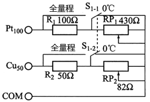 S1是一個KN型的雙極雙位鈕子開關.當S1開關在“0℃”位置時,它把兩只電位器都短接了,這時從Pt100端與COM端輸出的電阻值為100Ω,對應溫度為0℃。從Cu50端與COM端輸出的電阻值為50Ω,對應溫度為0℃。可用來檢查熱電阻輸入的數顯表的0℃點顯示是否正常。