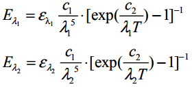 設(shè)長(zhǎng)波(紅外線)波長(zhǎng)為λ1,短波波長(zhǎng)為λ2,光譜發(fā)射率分別為ελ1和ελ2,根據(jù)普朗克定律,兩種波長(zhǎng)的輻射能量為