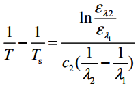 比色高溫計(jì)是按照黑度刻度的,用這種刻度的高溫計(jì)去測(cè)量實(shí)際物體,所得到的溫度示值為被測(cè)物體的“顏色溫度”。若黑體在λ1和λ2兩種波長(zhǎng)下,在溫度為TS時(shí)的輻射能量之比和實(shí)際物體在溫度T時(shí)的輻射能量之比相等,則TS為該物體的“顏色溫度”,二者之間存在以下關(guān)系