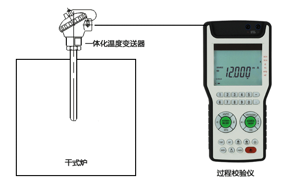 本文依據JJF 1183-2007《溫度變送器校準規范》,對一體化溫度變送器進行了示值校準。校準環境條件:溫度20℃、相對濕度42%RH。一體化溫度變送器校準原理圖如圖1所示。將一體化溫度變送器放入干式計量爐插口中,干式計量爐讀數顯示溫度值,溫度變送器將溫度信號轉換成4-20mA的直流信號輸出,用過程校驗儀YR100讀取輸出的信號值。