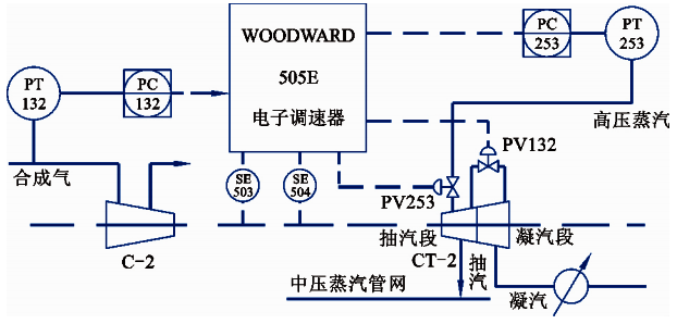 因此PV253與PV132閥的開度和高壓蒸汽的耗氣量、透平的轉(zhuǎn)速、抽汽有著密切關(guān)系。同時(shí)由于PV253控制合成氨裝置高壓蒸汽管網(wǎng)的壓力,因此100CT2的穩(wěn)定運(yùn)行是合成氨裝置穩(wěn)定運(yùn)行的重要保障。100CT2的調(diào)速系統(tǒng)采用美國(guó)伍德沃德505調(diào)速器,主要實(shí)現(xiàn)壓縮機(jī)組的啟動(dòng)控制和運(yùn)行時(shí)的轉(zhuǎn)速與抽汽壓力控制。