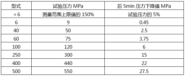 校驗(yàn)器應(yīng)能在表3規(guī)定的壓力下,承受10min的強(qiáng)度和密封試驗(yàn)。從6min開始計(jì)算,在后5min內(nèi)壓力的下降值應(yīng)不大于表3規(guī)定