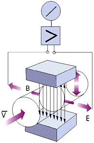 測量流量時,導(dǎo)電性液體以速度V流過垂直于流動方向的磁場,導(dǎo)電性液體的流動感應(yīng)出一個與平均流速成正比的電壓,其感應(yīng)電壓信號通過二個或二個以上與液體直接接觸的電極檢出,并通過電纜送至轉(zhuǎn)換器通過智能化處理,LCD顯示或轉(zhuǎn)換成標(biāo)準(zhǔn)信號4-20mA和0-1kHz。