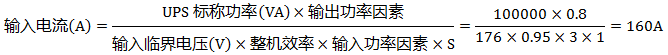 例1:已知:UPS功率100kVA,輸入臨界電壓176V,輸入功率因數0.99(高頻機都可以近似取1,工頻機取值0.85),整機效率0.95,S=3,輸出功率因數0.8。