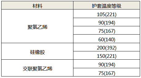 表6 電纜護套材料及對應的溫度等級 ℃(°F)