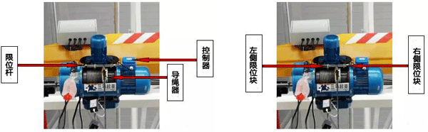 這是由斷火限位器和葫蘆鋼絲繩上的導繩器共同決定的:斷火限位器是雙向限位:左邊是推分常閉觸頭,右側是拉分常閉觸頭。
