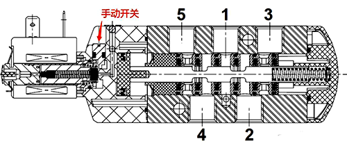 當ASCO 531電磁閥電源故障沒電時,可以通過手動開關控制閥位切換,逆時針旋轉手動開關,鐵芯向左運動,閥芯向右運動,進氣口1與出氣口4相通;