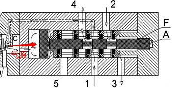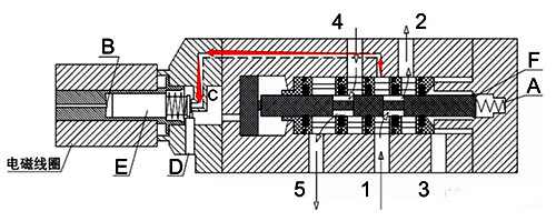 在電磁閥失電狀況下,進氣口1與出氣口2相通,出氣口4與排氣孔5相通,活塞F在閥內彈簧A的彈力下保持在左邊的位置,進氣口1處的氣源通過下圖紅色箭頭孔(該進氣孔為獨立孔,只與進氣口1連接,不與出氣口4連接)連接腔室內的C進氣口;
