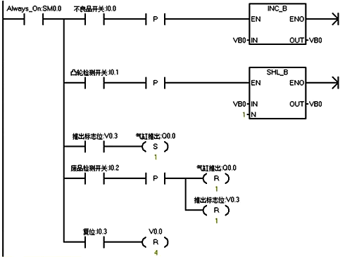 2、當移動了4次后,VB0中的V0.3位為1,而產品剛好到達第“4”號工位,Q0.0為1,氣缸推出。