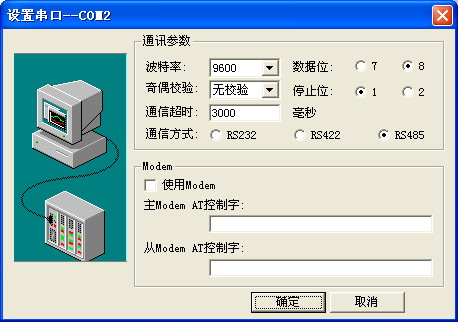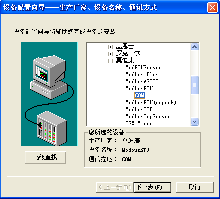 選擇PLC選項下的--莫迪康--ModbusRTU--com,單擊“下一步”,打開如圖: