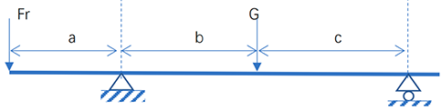此時電機轉子重力G作為徑向力存在,負荷與軸承的距離分別為a,b,c。軸系統運行的時候,除了周向保持自由旋轉,其他方向全部穩定,因此可以根據力矩平衡計算兩個軸承的受力。我們稱左邊軸承為1號軸承,右邊為2號,以1號軸承為支點的力矩平衡方程為: