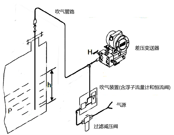 吹氣式液位計(jì)可對敞口或密閉容器內(nèi)的液體進(jìn)行測量。除吹氣管與被測介質(zhì)接觸外,吹氣裝置主要設(shè)備和液位變送器的測量元件均不與被測介質(zhì)接觸,結(jié)構(gòu)簡單可靠,從而保護(hù)了測量元件,減少了儀表的維護(hù)量,增加了測量的可靠性。吹氣式液位計(jì)除了能測量普通液體的液位外,特別適用于惡劣環(huán)境下,例如腐蝕性液體、黏度較大液體、易結(jié)晶液體、高溫液體的液位,廣泛應(yīng)用于石化企業(yè)中。