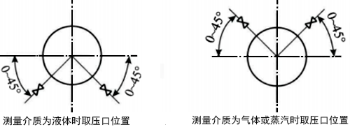 取壓口一般設置在法蘭、環(huán)室或夾持環(huán)上,當測量管道為水平或傾斜時取壓口的安裝方向如下圖所示。它可以防止測液體時氣體進入導壓管或測氣體時液滴或污物進入導壓管。當測量管道為垂直時,取壓口的位置在取壓位置的平面上,方向可任意選擇。