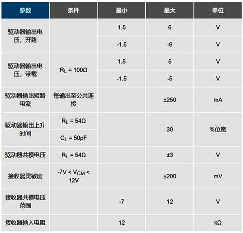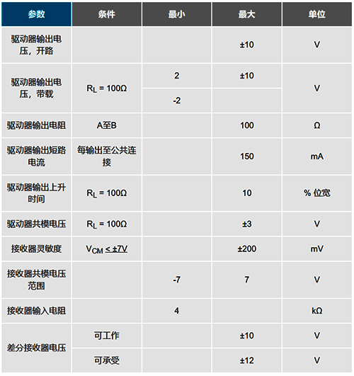 RS422和RS485收發器往往容易混淆,往往將其中一個當做另一個的全雙工版本。然而,其共模范圍及接收器輸入電阻方面的電氣差異使得這些標準適合于不同的應用。由于RS485滿足所有的RS422規范(表3),RS485驅動器可用于RS422應用。然而,相反則不成立。RS485驅動器的共模輸出為-7V至+12V,而RS422的共模范圍僅為±3V。RS422驅動器的最小接收器輸入電阻為4kΩ,而RS485驅動器則為12kΩ。