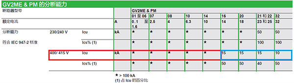 先看GV2電動機保護斷路器的短路分斷能力,GV2ME01~14的短路分斷能力>100kA(400/415V),而且Ics=Icu,但是GV2ME16~32的短路分斷能力就只有15/10kA左右,并且Ics=50%Icu。