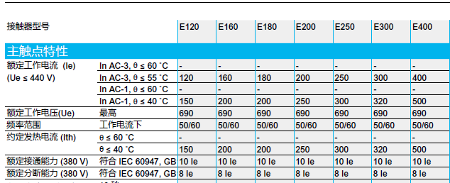 或選擇AC-1電流至少為272A且符合GB/T18487.1標準50K溫升要求的接觸器,如下表所示。