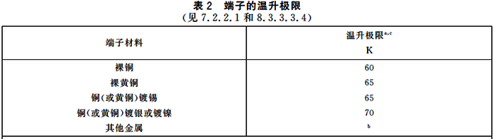 2015版和202X版充電樁標準GB/T18487.1都要求樁內元器件(斷路器和接觸器)的端子,在充電機最大輸出電流下長期運行,極限溫升不超過50K,見下表2。