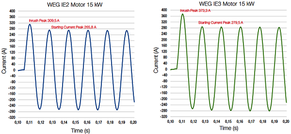 以15kW電動機為例,IE2電動機的沖擊電流峰值309.5A,起動電流峰值為265.8A,而IE3電動機的沖擊電流峰值為373.3A,起動電流峰值為275.5A,無論是沖擊電流還是起動電流,IE3都比IE2電機高。