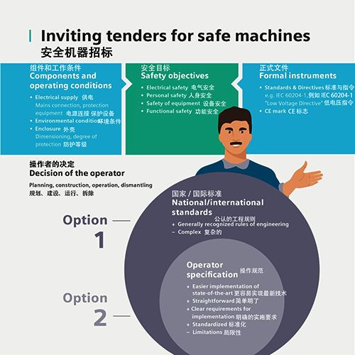 運營商在招標購買符合標準并因此安全的機器時有兩種選擇。他們可以只規定一般有效的標準,也可以在這些標準的框架內,根據自己的需要制定技術規范。