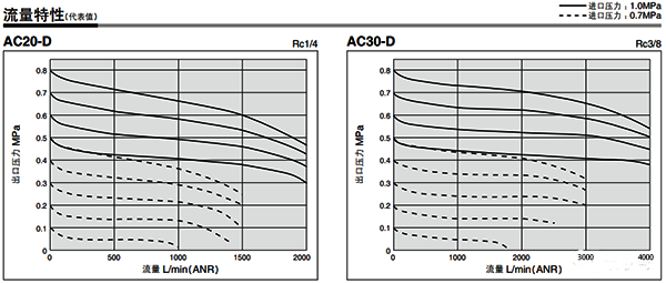 如AC30-D三聯(lián)件在進(jìn)口壓力1MPa,出口壓力在0.7MPa,壓降0.05~0.08MPa的情況下,那么三聯(lián)件流量值為1000L/min~2000L/min。