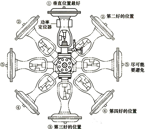 調節閥安裝位置比較圖如下圖所示,安裝位置①是最佳安裝位置,即垂直安裝;安裝位置⑤是最差位置,要盡量避免;安裝位置②是次選位置。如果沒有足夠空間,可選擇位置③和④。