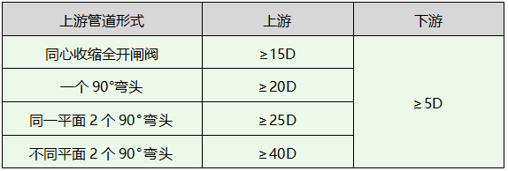 渦街流量計安裝位置的上下游管道內(nèi)徑應(yīng)與傳感器公稱通徑相同,其應(yīng)滿足下式的要求(同軸偏差應(yīng)不大于0.05DN):0.98DN≤D≤1.05DN,公式中DN為渦街傳感器通徑;D為管道內(nèi)徑。