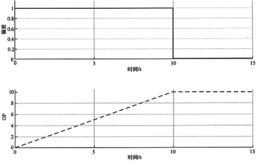 如圖2所示,積分作用相當于斜率發生器,如果控制器輸入偏差不等于0,控制器的輸出將按照一定的速度一直朝一個方向累加下去。