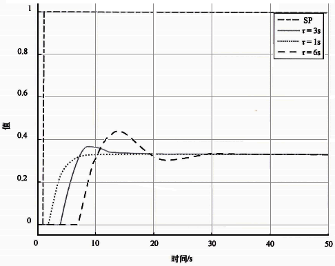 圖3是不同純滯后時間基準自衡對象Kc=0.25時設定值階躍響應??梢园l現:隨著被控對象純滯后時間的增加,設定值階躍響應的振蕩逐漸加劇。所以最優比例增益應該和被控對象的純滯后時間成反比。被控對象純滯后時間越大最優比例增益應該越小,反過來被控對象純滯后時間越小最優比例增益應該越大。