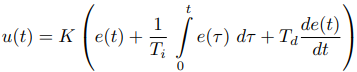 其中,u(t)是控制器輸出,e(t)是控制誤差,即設定值r與過程輸出y之間的差異??刂茀捣謩e是比例增益K、積分時間常數Ti和微分時間常數Td。這種控制結構被稱為線性或標準PID形式,但并行和交互形式也可以考慮(?str?m和H?gglund,2006)。