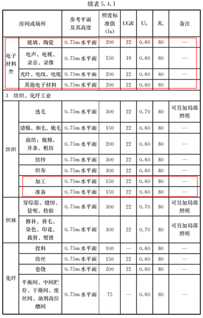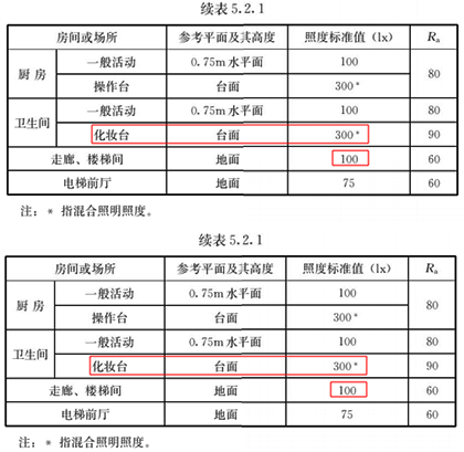 在5.2.1 住宅建筑照明標準值中針對以下2處的照度標準值進行了提高,一處是臥室的床頭或臥室閱讀使用;一處是走廊、樓梯間。并且新增了在衛生間使用化妝臺時的照度標準值。