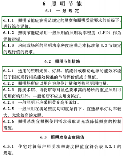 6.3 照明功率密度限值中現行值和目標值,比舊版標準中均有提升,這里就不再贅述。