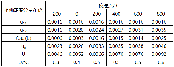 3.3 對(duì)測(cè)量范圍-200~800℃的不帶傳感器的熱電阻的溫度變送器在各校準(zhǔn)點(diǎn)的的測(cè)量不確定度的評(píng)定見(jiàn)表6。